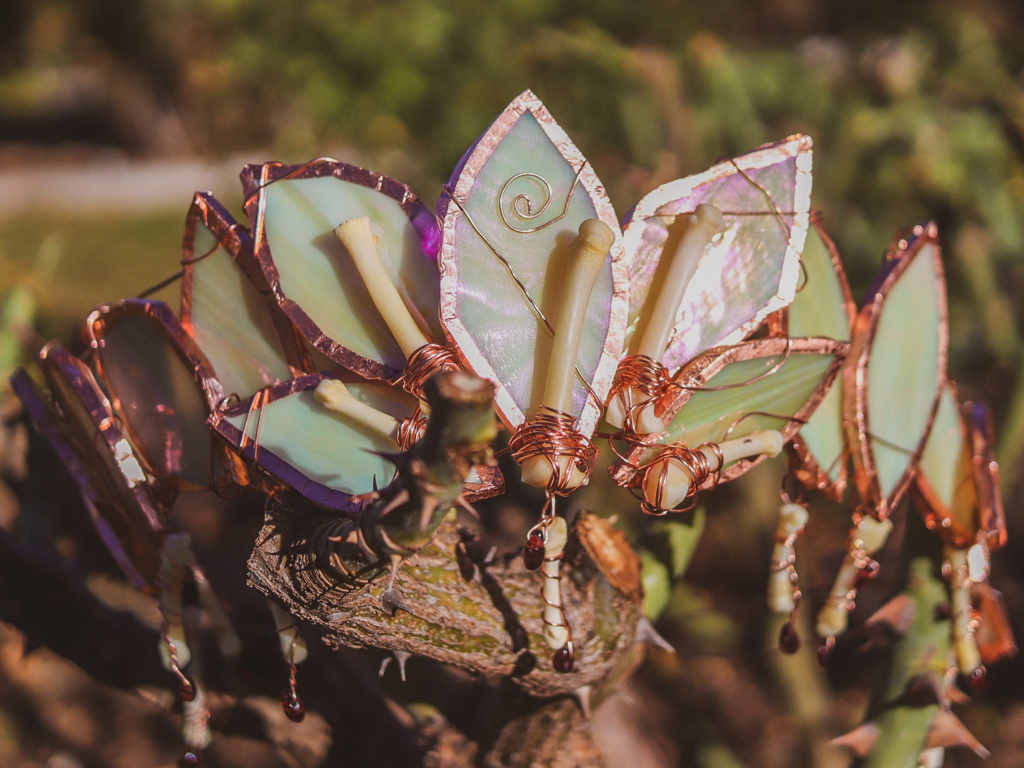 My next big build was another John crown, which I made out of stained glass, copper wire, raccoon finger bones, and garnets.