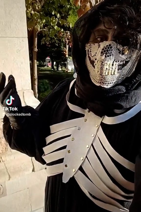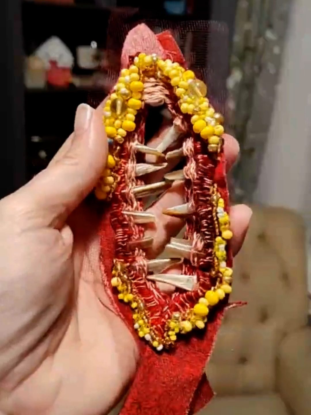 The mask is glorious but also now exists only as an art object because Alecto [cat] peed on it. This is 100% a salvage piece, incorporating scrap cotton, a bit of an antique tablecloth, leftover raccoon flanges from the crown project, pearls, carved-bone roses, and little gold tone spacer beads I had around. I love how it turned out and I’m sad that it’s too delicate to clean the cat pee out of.