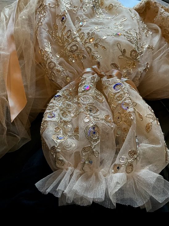 I took a bunch of photos of the robes as I was constructing them and then deleted them because who wants to see construction photos of my house robes. The robes are also heavily beaded and have satin ribbon details. The gold embroidery is how the fabric came but all the pink, blue, and purple notes I added. I did also add some gold and translucent-opal beads but of course they are invisible.