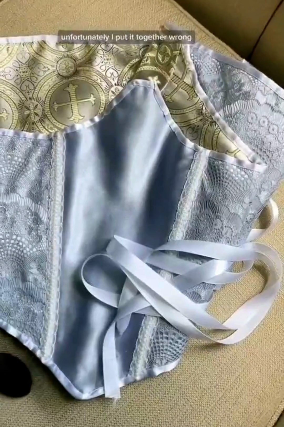 The waist cincher is silly. One side is a polyester satin-finish brocade that wants to fray in every direction, and the other side is polyester satin overlaid with lace. Also I made a frustrating construction error so right when I thought I was done, I wasn’t.