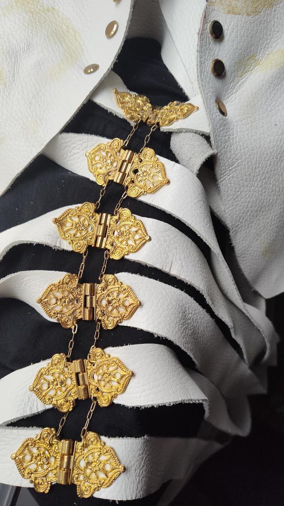 Ultimately I like this more as an art object than as a costume piece. The spine is made of gold hinges and chain.