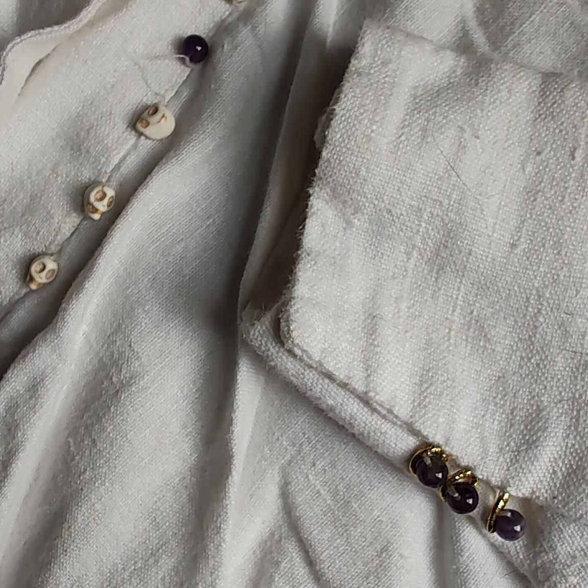 The front buttons down with skulls with an amethyst after every nine skulls (also stash items), and the sleeves close with three amethysts. The closures are fake. Coronabeth holds it together with the waist cincher and Kiriona holds it together with pins or just by tucking it in.