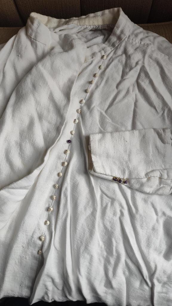 The shirt is similar in construction to Harrow’s shirt but it has longer cuffs, a shorter collar, less gathering, and is made of a stiffer fabric. This was stash fabric and I don’t totally know what it is, but some kind of cotton-linen blend probably. I think I used two different fabrics, one for most of it and one for the cuffs and the front panel, which are just a little stiffer. Corona’s blouse features an asymmetrical cross-over design referencing fencing jackets. When I designed this I planned to use it for both Corona and Kiriona, with Corona having it styled open and Kiriona styling it more buttoned up.