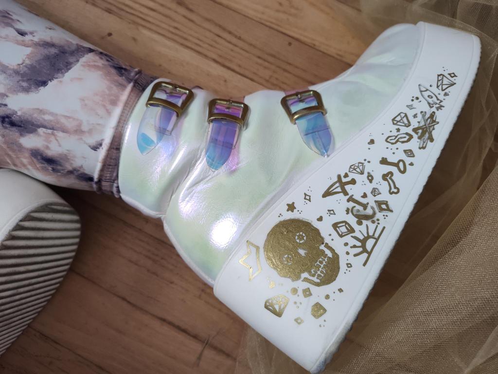 The boots are a lovely pearlescent PVC with pinky-purply-blue straps, and I painted the hardware gold and added gold doodles that I thought Corona would like. Also when I wear them at conventions I am 6’3″ and that’s, that’s gender, babes.